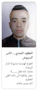 وحسب ذات المنشور الذي تناقلته بعض الصفحات بمدينة أصيلة، فإن المفقود كان يعمل كجندي وهو من فوج الهندسة بمديونة الدار البيضاء، حيث لم يتم العثور عليه أو على جثته لحدود الساعة.