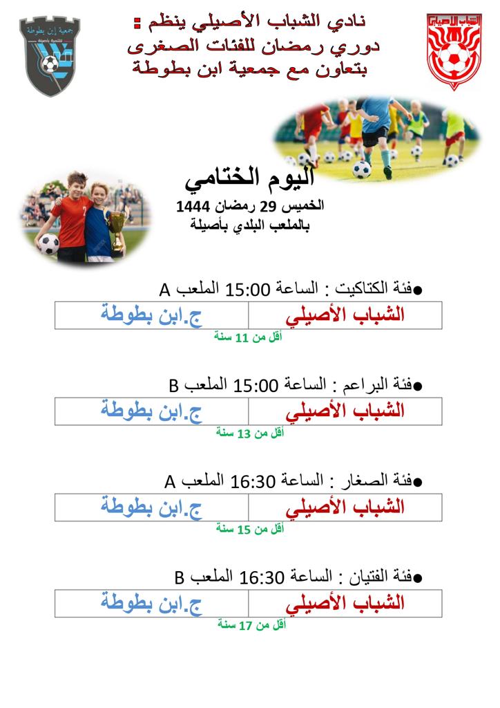مقابلات النهائي في فئات الكتاكيت والبراعم والصغار والفتيان سوف تجمع بين فريق الشباب الأصيلي وأيضا جمعية ابن بطوطة وفق البرنامج الثالي: